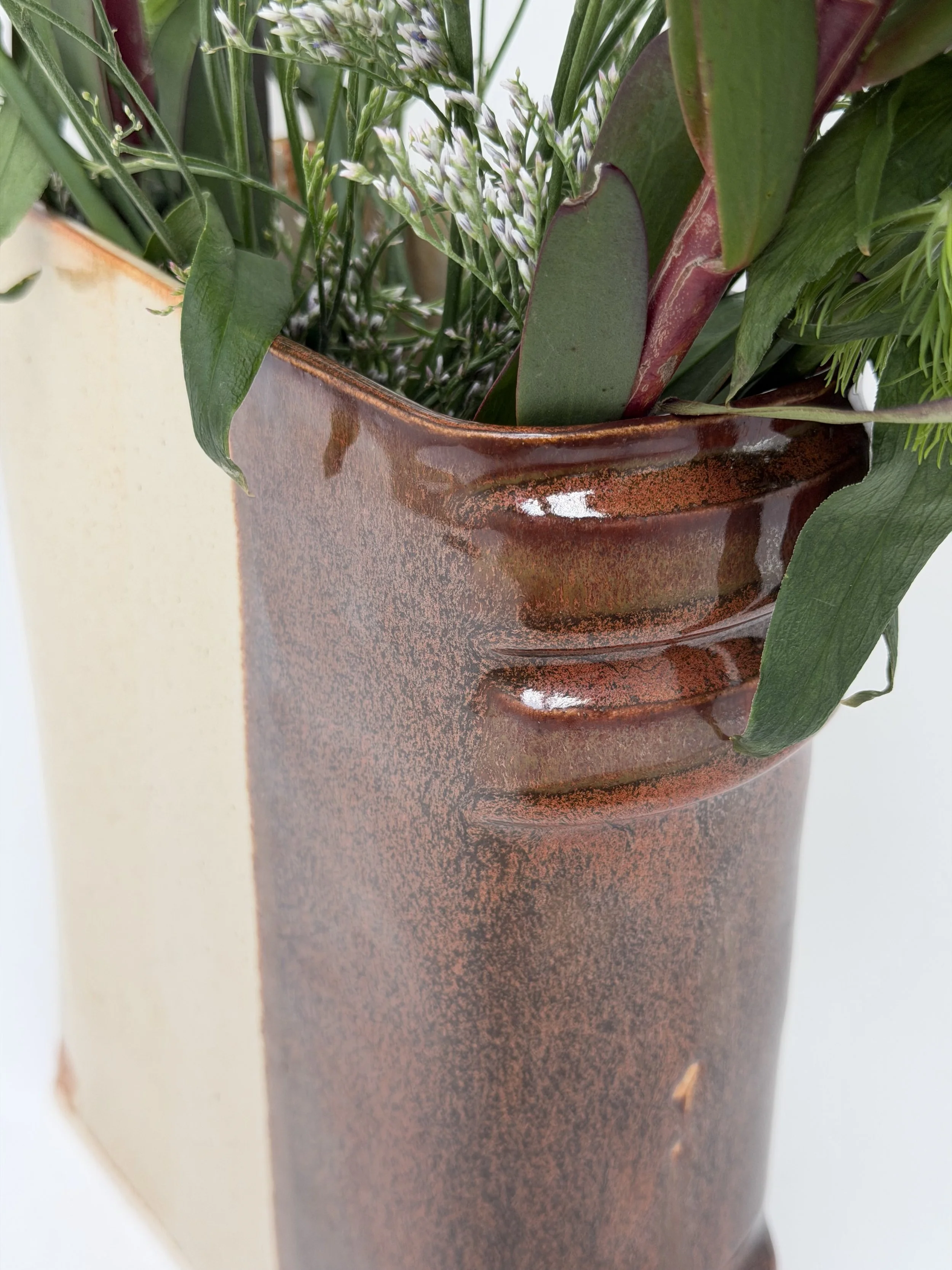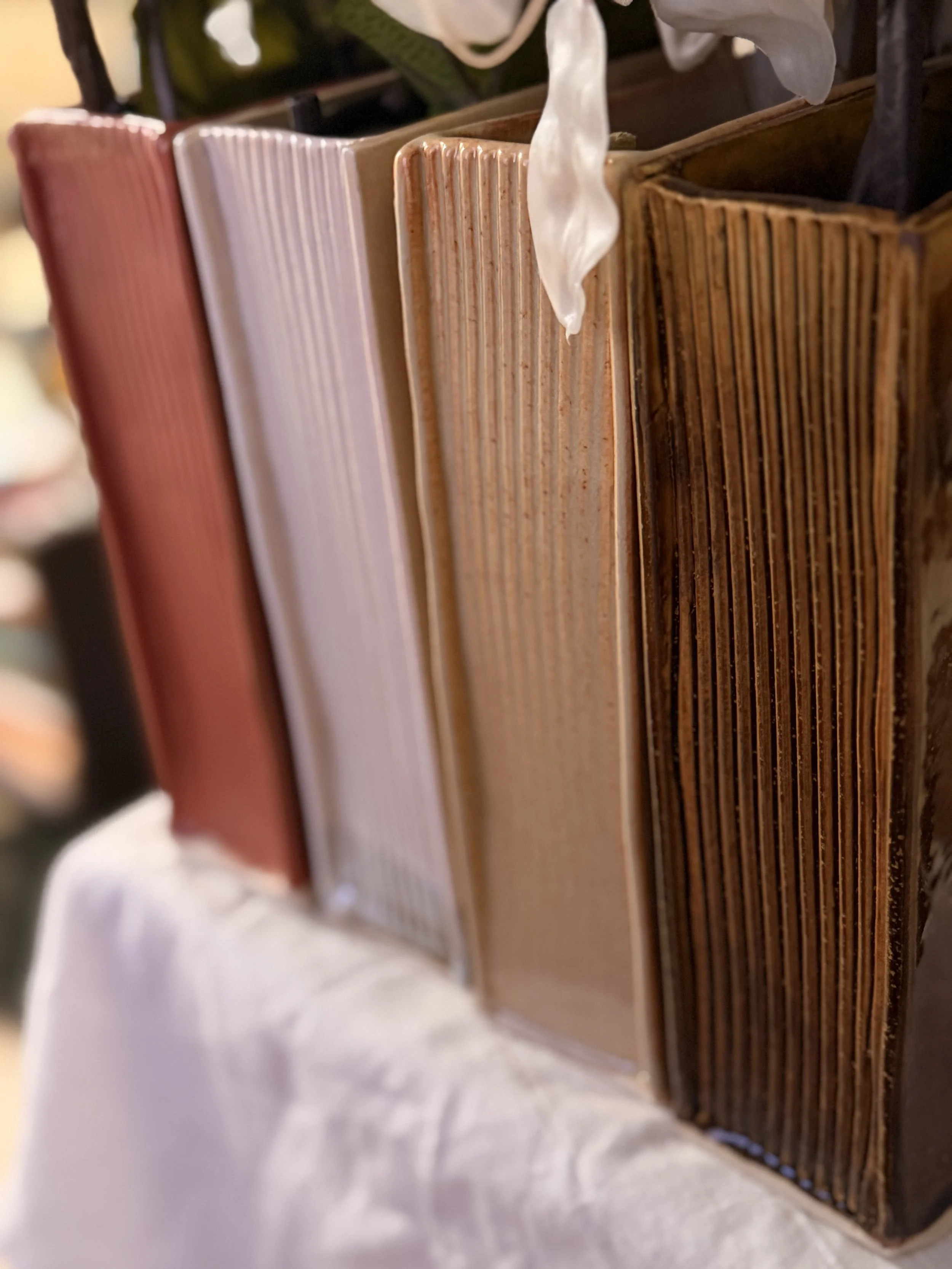 9'“ by 6” by 2.5” Lineage Book Vases are available in white or brown stoneware. Various glaze options available. Spine text to be provided by client.