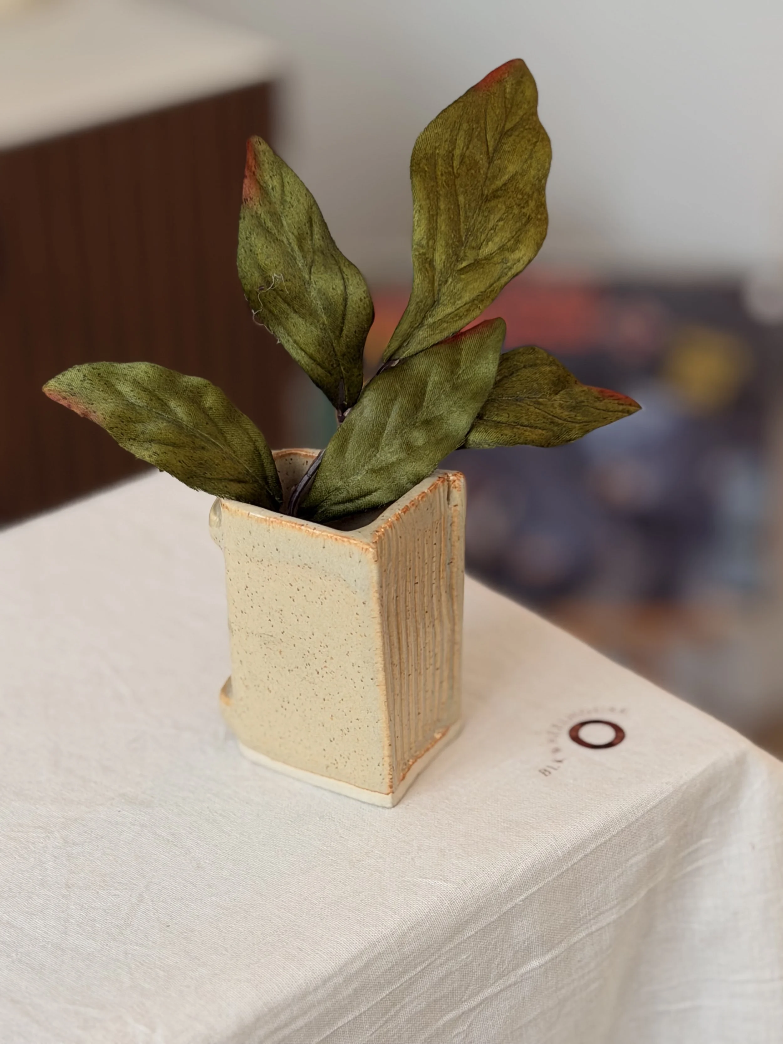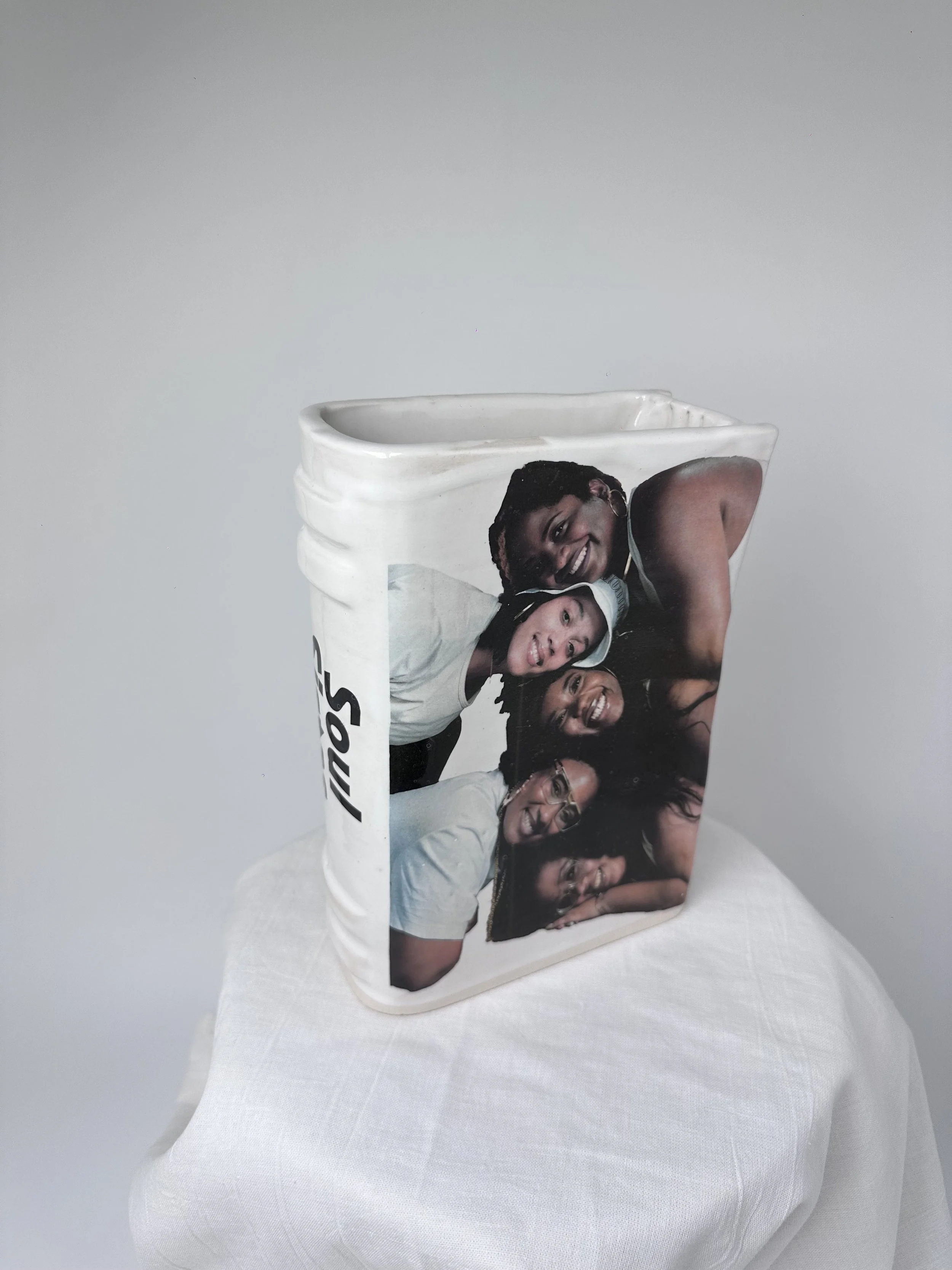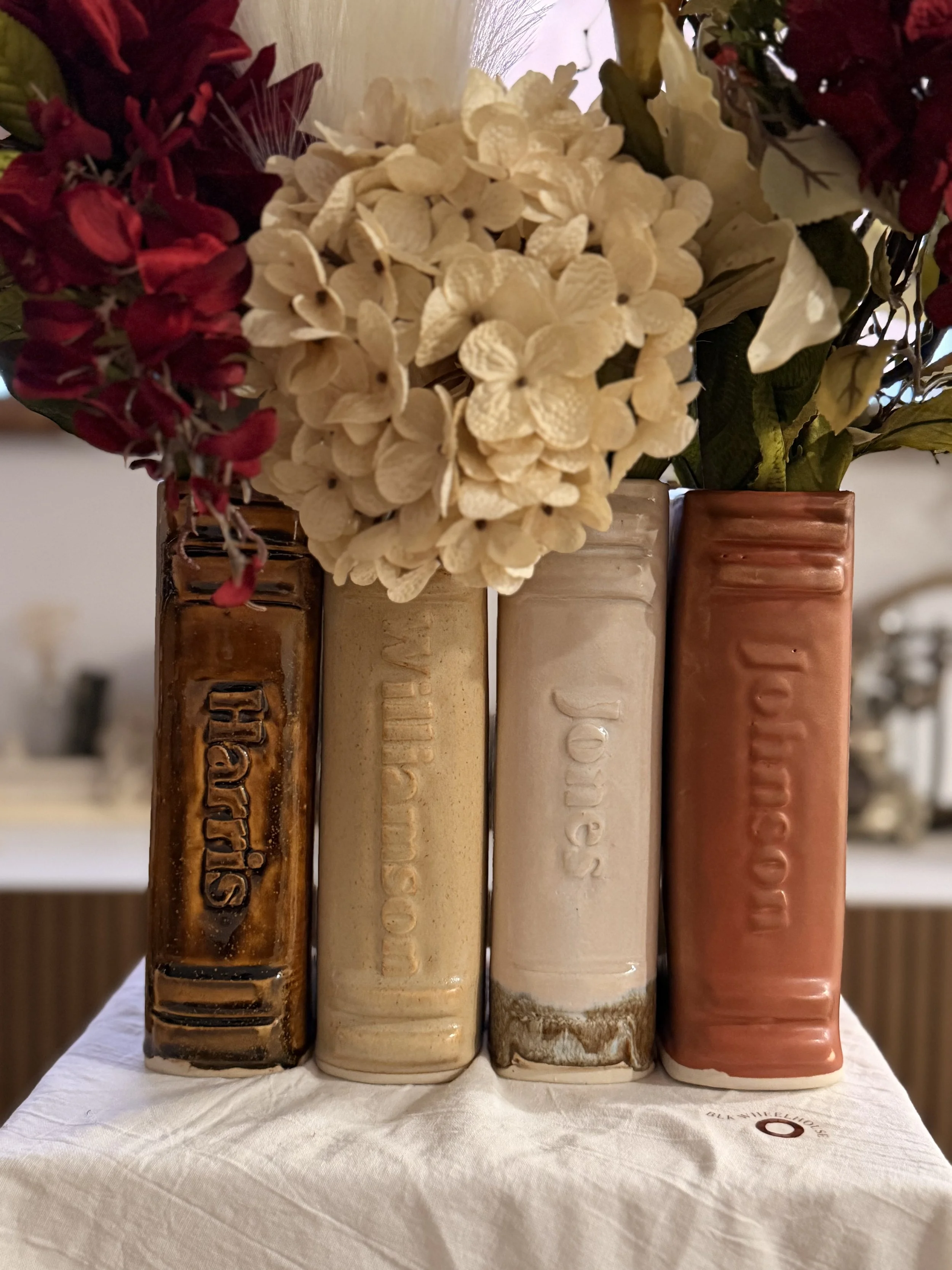 The studio's signature form: ceramic vessels shaped like books, named and held. A commissioned Lineage Book Vase carries the names that matter to you: a matriarch's full name pressed into the spine, a family surname running the length of the cover, titles that belong to someone who never got their flowers while they stood. They are watertight vessels you fill with water and blooms. They live on shelves where they can be seen daily, touched often, asked about by everyone who enters the room.