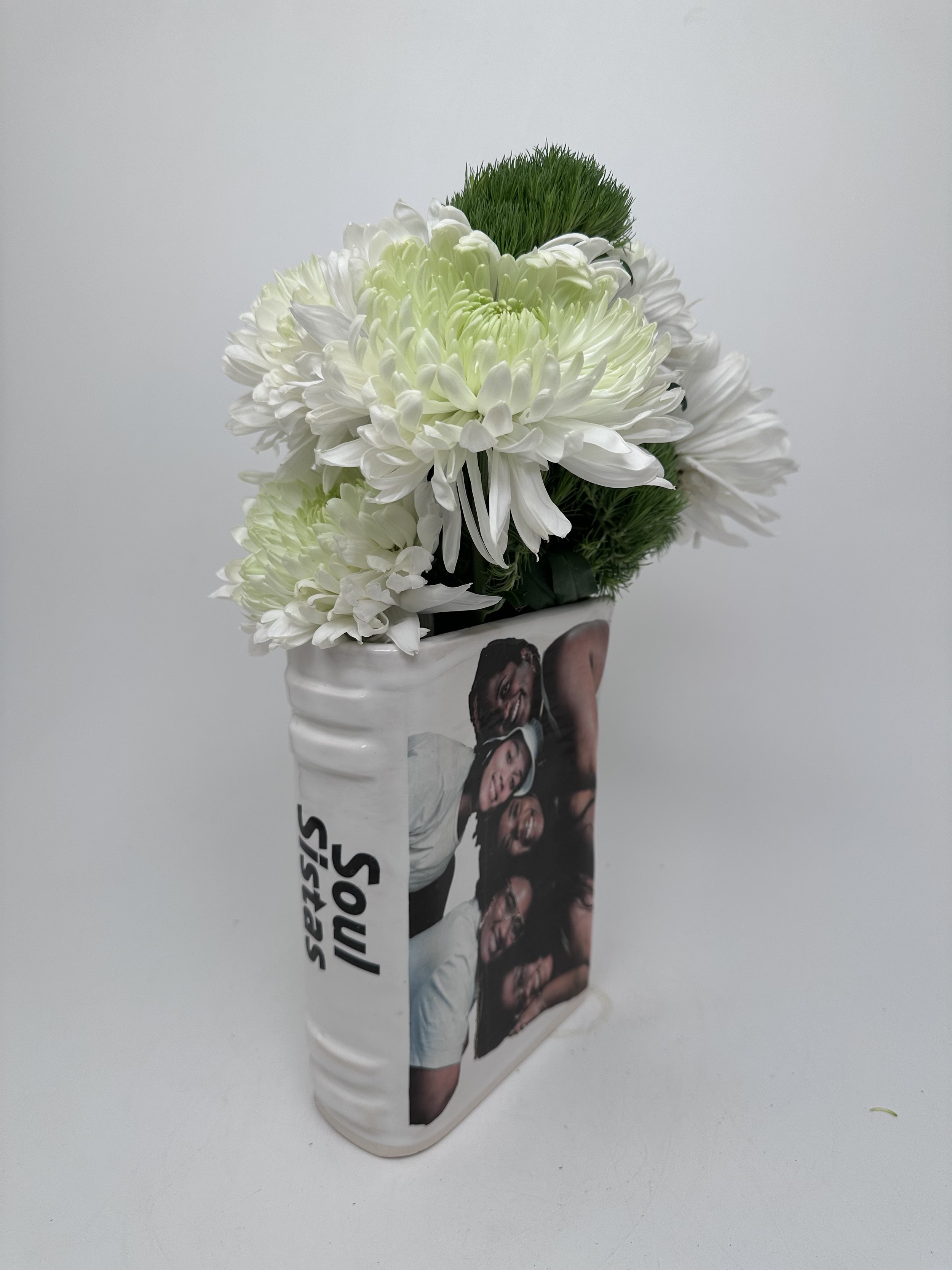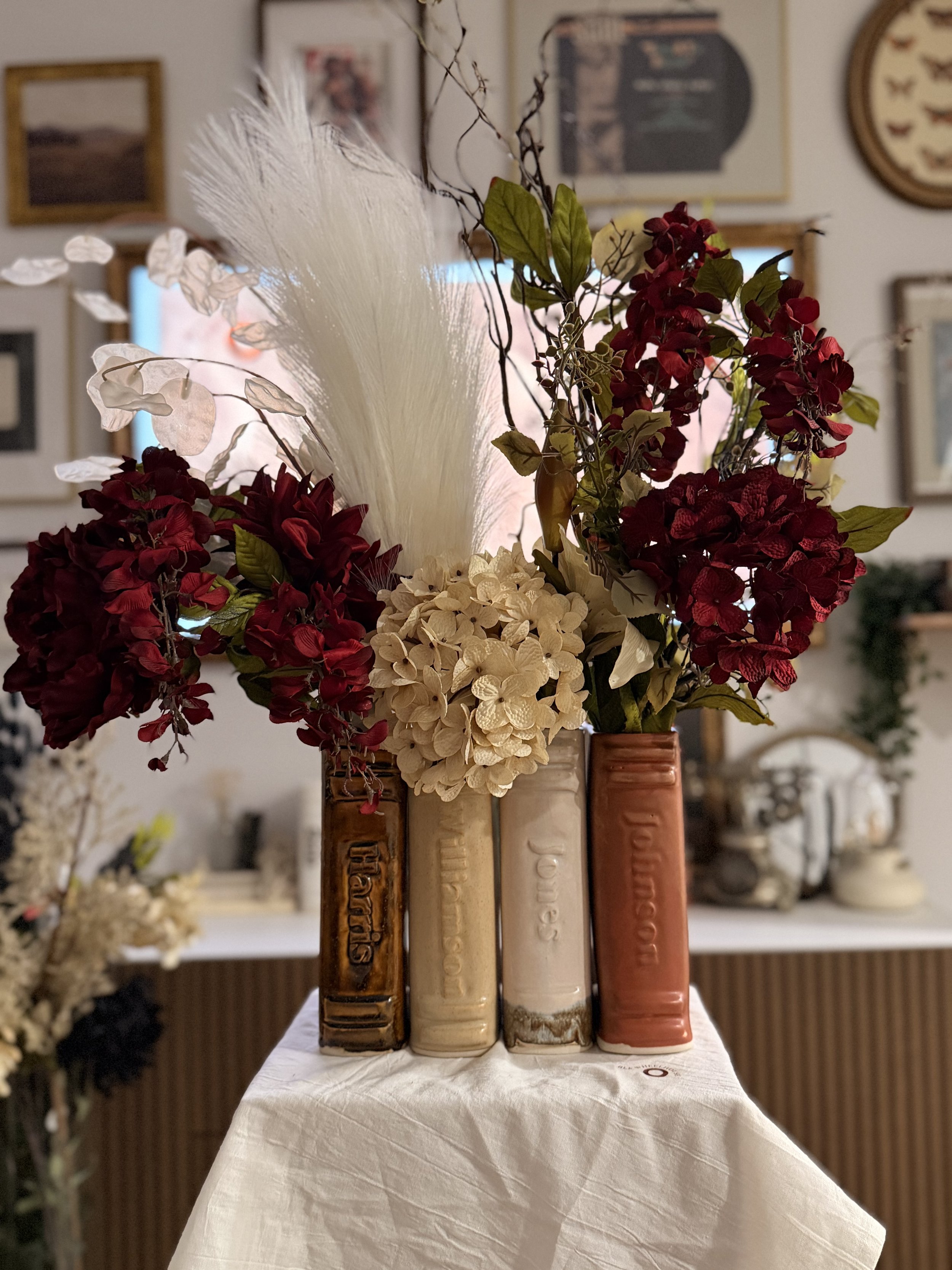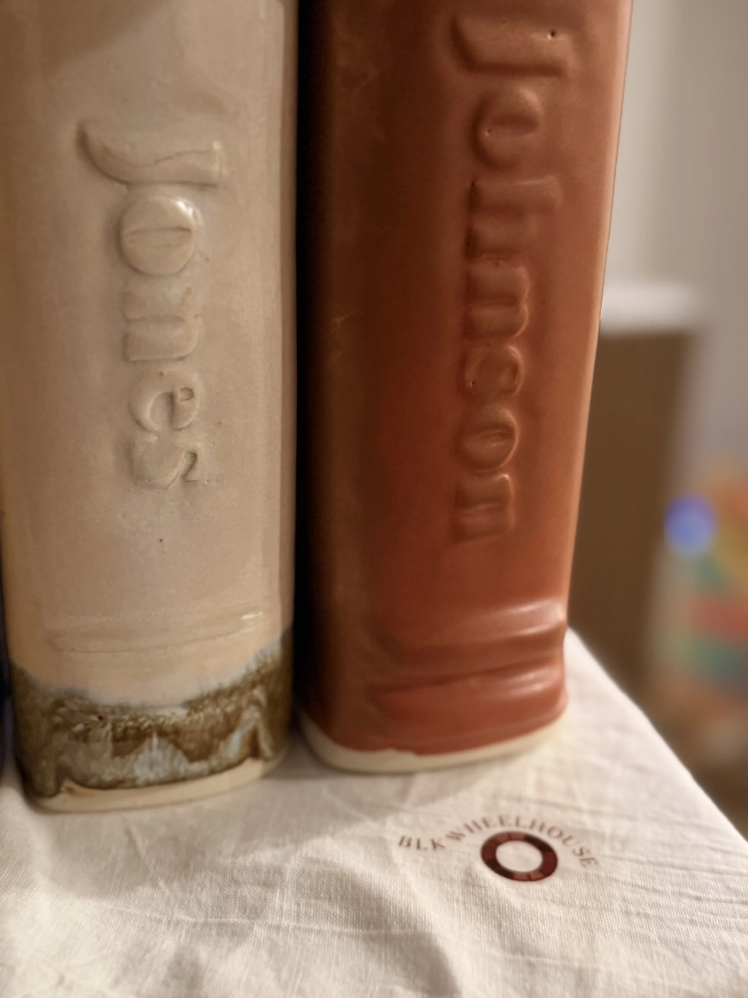 The studio's signature form: ceramic vessels shaped like books, named and held. A commissioned Lineage Book Vase carries the names that matter to you: a matriarch's full name pressed into the spine, a family surname running the length of the cover, titles that belong to someone who never got their flowers while they stood. They are watertight vessels you fill with water and blooms. They live on shelves where they can be seen daily, touched often, asked about by everyone who enters the room.