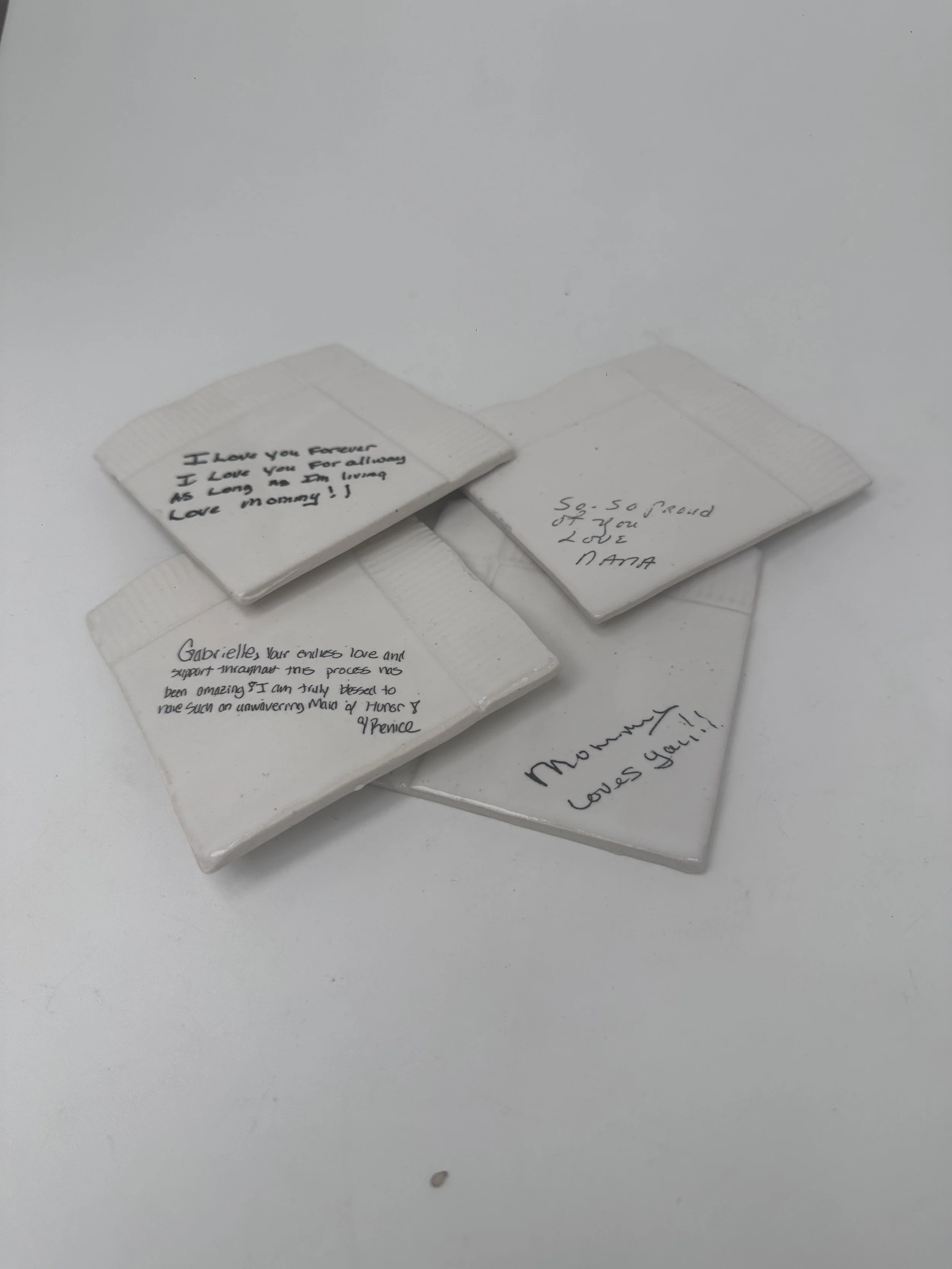 Handwritten words preserved in clay. A message that began on paper — or lived only in your chest — pressed into the surface of a ceramic piece that will outlast the moment that inspired it. These pieces carry love letters, long-overdue words, expressions that arrived too late or right on time. The writing becomes texture. The feeling becomes form.