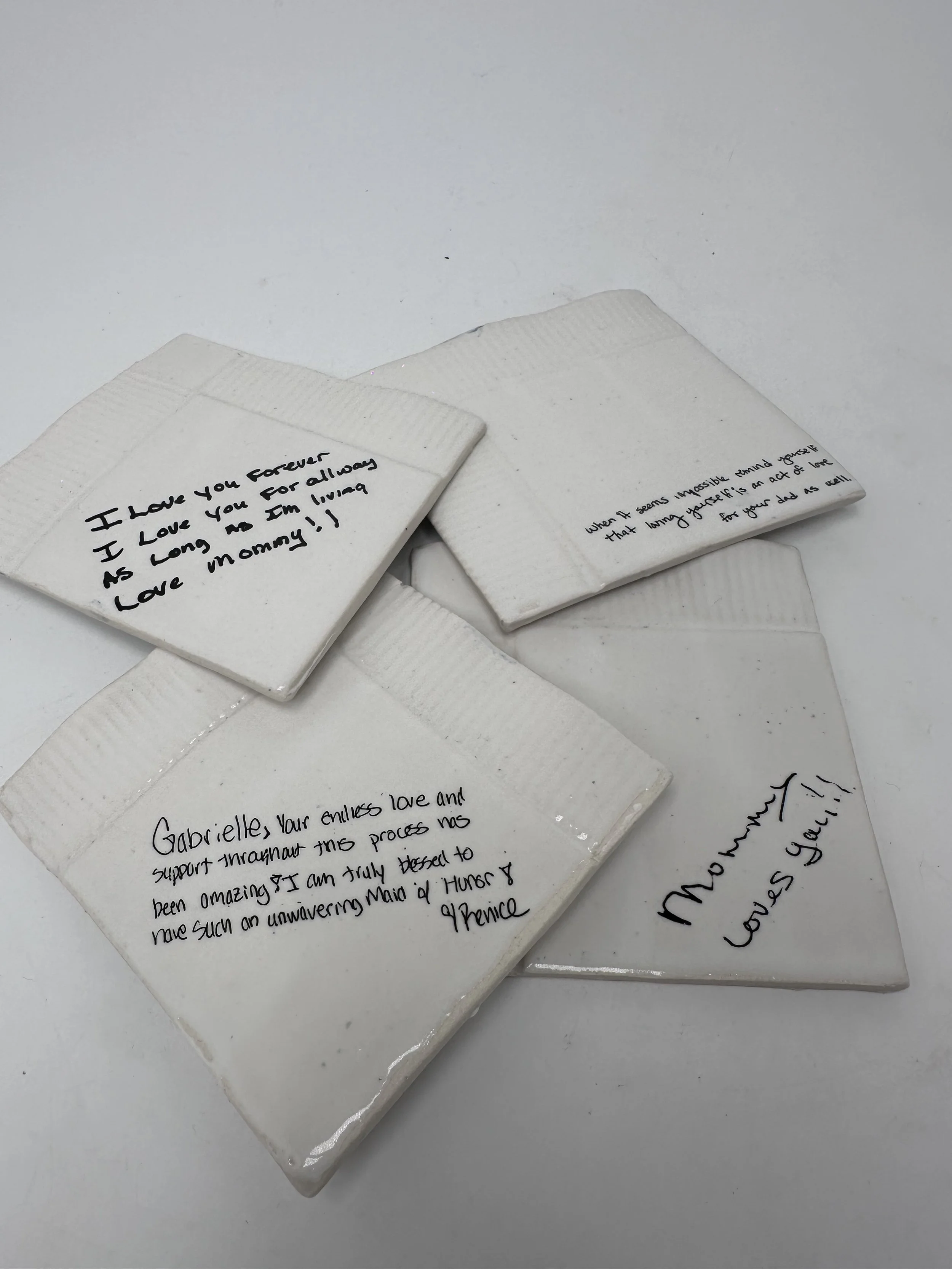 3” by 3” Ceramic Napkins are available in white or brown stoneware with black lettering and a clear glaze. Message to be provided by client.