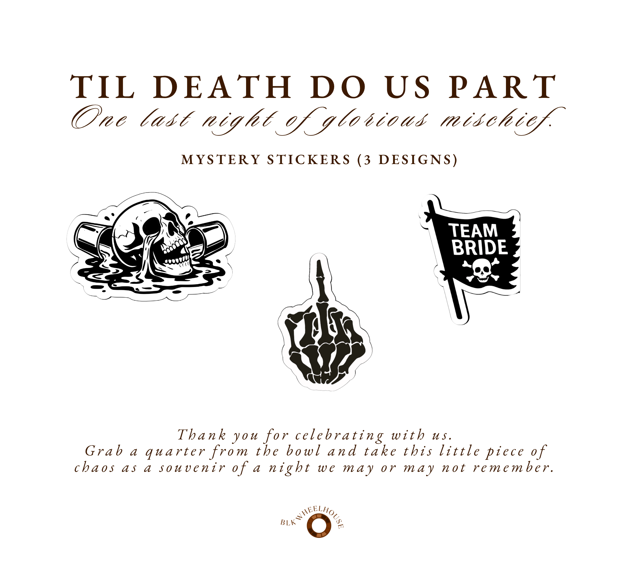 A dark-romantic send-off for the bride who knows exactly who she is. Black lace energy, love letters to chaos, and one last night of glorious mischief, all of it dispensed from the machine.